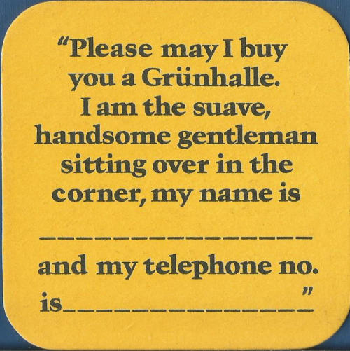 Grünhalle Lager - Another fake continental lager that British brewers were so fond of producing in the 1970's and 80's. Grunhalle gets it's name from a very literate German translation of Green-(H)alls. Brewed from around 1967 to 1990.